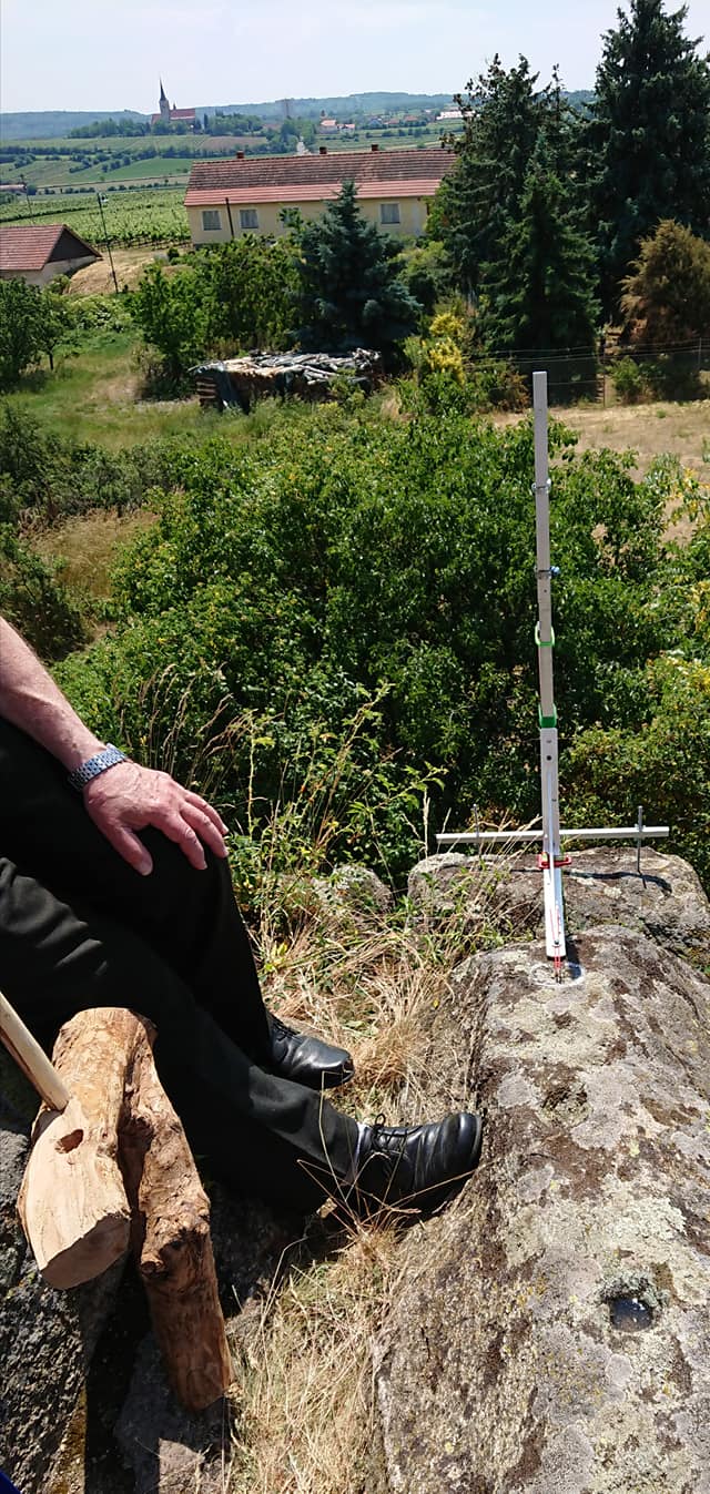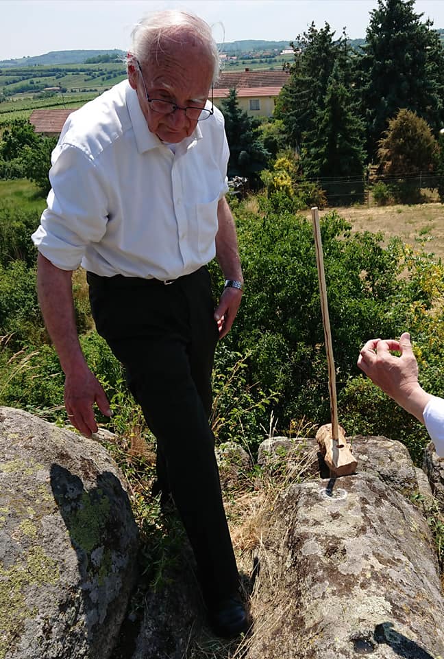 ![]() Prof. Puschnik mit "urzeitlichem" Schattenstab am Kalenderstein in Leodagger bei Pulkau NÖ. |